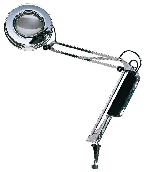 Lampada a lente bifocale 3+7,5dt, senza stativo. Proiettore con lente d’ingrandimento biconvessa in vetro ottico completo di lampadina fluorescente fredda da 22W, protetta da uno schermo frangiluce. Con alimentatore elettrico 220V, cavo d’alimentazione e presa europea standard Schuko.
