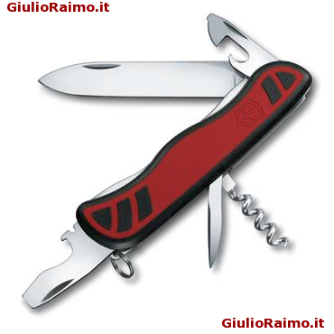 Guance: Nylon rosso/nero. 1. Lama grande bloccabile 2. Cavatappi 3. Apriscatole con 4. - Cacciavite piccolo 5. Levacapsule con 6. - Cacciavite 7. - Spelafili 8. Alesatore / Punteruolo 9. Anello portachiavi
