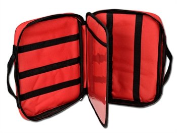 Realizzata in 2 parti, con strisce elastiche per portare 9 fiale grandi e 37 piccole. Scomparto centrale con finestra trasparente in polivinile per documenti.