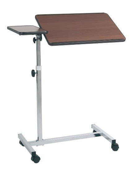 Struttura in acciaio cromato due piani di cui uno inclinabile. Superficie in laminato antigraffio con bordo di contenimento.