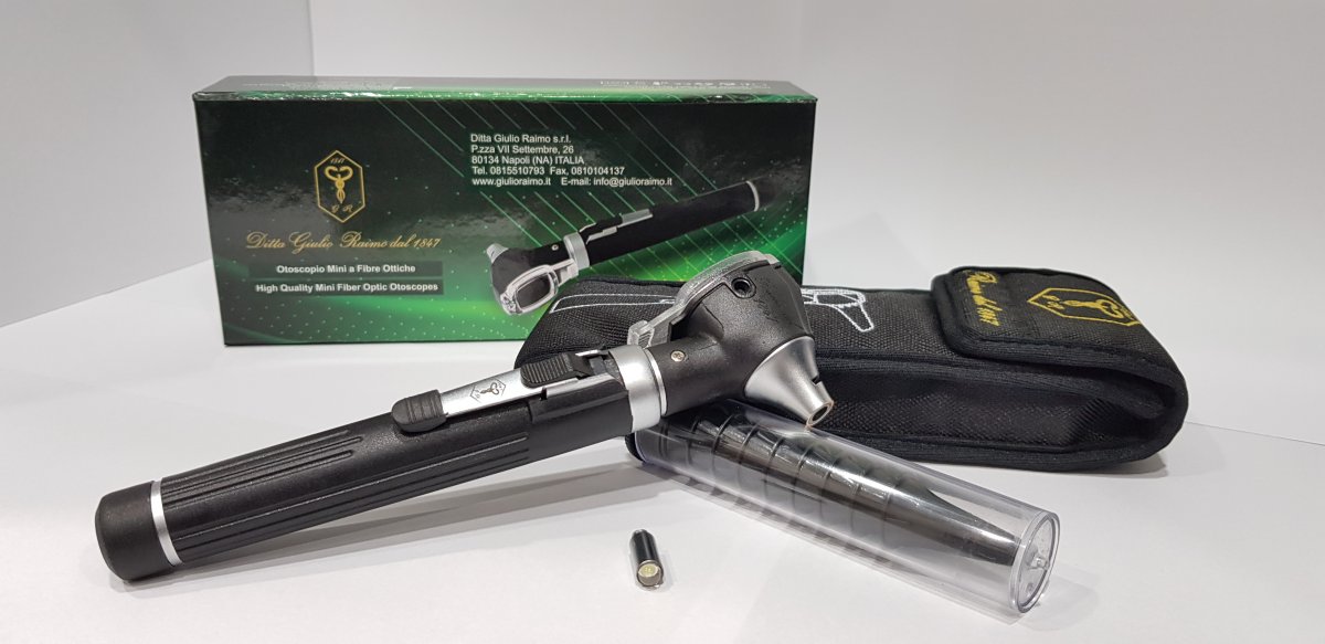 Otoscopio a fibre ottiche con lampadina a led a luce bianca, foro per insufflazione auricolare, lente ingrandimento 3x.