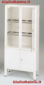 Armadio costruito interamente in lamiera d’acciaio verniciata. Due scomparti sovrapposti. Scomparto superiore con due ante battenti in vetro con serratura e due ripiani in acciaio inossidabile regolabili in altezza. Scomparto inferiore con due porte in lamiera d’acciaio verniciata. Un ripiano interno in lamiera d’acciaio verniciata.