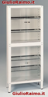 Struttura in lamiera d’acciaio verniciato. Quattro ante scorrevoli in vetro con chiusura a chiave. Quattro ripiani interni in acciaio inossidabile, regolabili in altezza.
