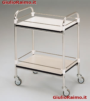 Struttura in tubo di lega leggera. Due piani in bilaminato spessore di 18mm. Montato su ruote di 80mm di diametro. Caratteristiche tecniche Con ringhiere CM 60x40x80H