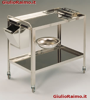 CARRELLO PER MEDICAZIONE Costruito interamente in acciaio inox. Due ripiani. Maniglia di spinta. Completo dei seguenti accessori in acciaio LQR[SRUWDÁDFRQLSRUWDULÀXWLUHWWDQgolare, porta catino e catino Ø 32 cm. Montato su ruote da 80 mm. M60