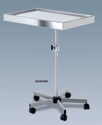 Per sala operatoria. Base in acciaio inossidabile a 5 razze con ruote diametro 50 mm. Telaio e vassoio asportabile in acciaio inossidabile. Altezza regolabile da 90 a 115 cm. Dimensioni vassoio: 70 x 45 x 1,7 h cm