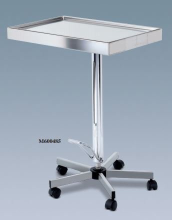 Per sala operatoria. Base in acciaio inossidabile a 5 razze con ruote diametro 50 mm. Telaio e vassoio asportabile in acciaio inossidabile. Altezza regolabile da 90 a 115 cm con pompa oleodinamica azionata a pedale.