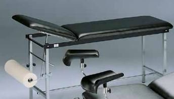 Struttura in tubo quadro d’acciaio cromato. Schienale regolabile. Imbottitura e copertura in materiale plastico lavabile. Smontato.