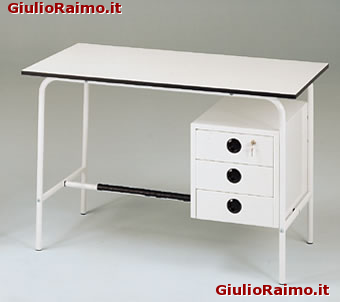Con cassetti laterali. Telaio in tubo d’acciaio verniciato. Ripiano in truciolare bilaminato.