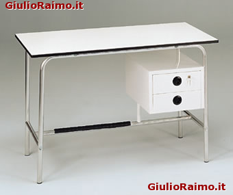 Con cassetti laterali. Telaio in tubo d’acciaio verniciato. Ripiano in truciolare bilaminato. Dim.120 x 70 x 80 h cm