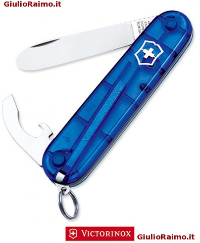 Multiuso da 84 mm dotato di guance traslucide blu... Caratteristiche tecniche: - lama senza punta - utensile multifunzione - levacapsule - apriscatole - cacciavite - spelafili - anello portachiavi - pinzetta - stuzzicadenti - nastro da collo - catenella - confezione regalo