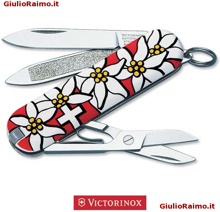 Multiuso da 58 mm, con guance che ritraggono la Stella Alpina. Caratteristiche tecniche - lama - lima per unghie con pulisciunghie - forbici - anello portachiavi - pinzetta - stuzzicadenti