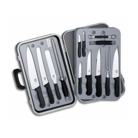 Valigia per cuochi nera, 49 x 31 cm con due robusti vassoi interni di plastica contenti attrezzi con manici neri. Contenuto: