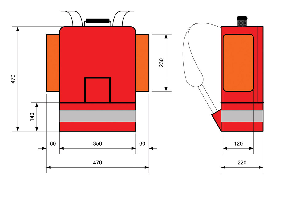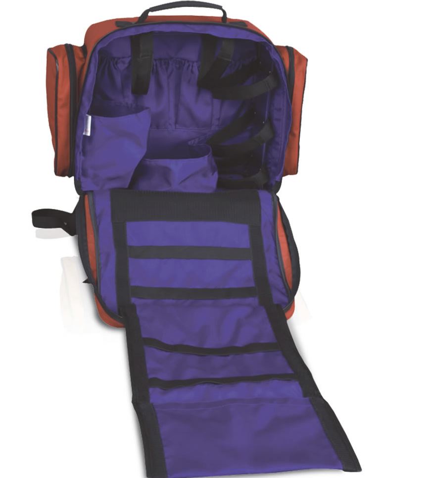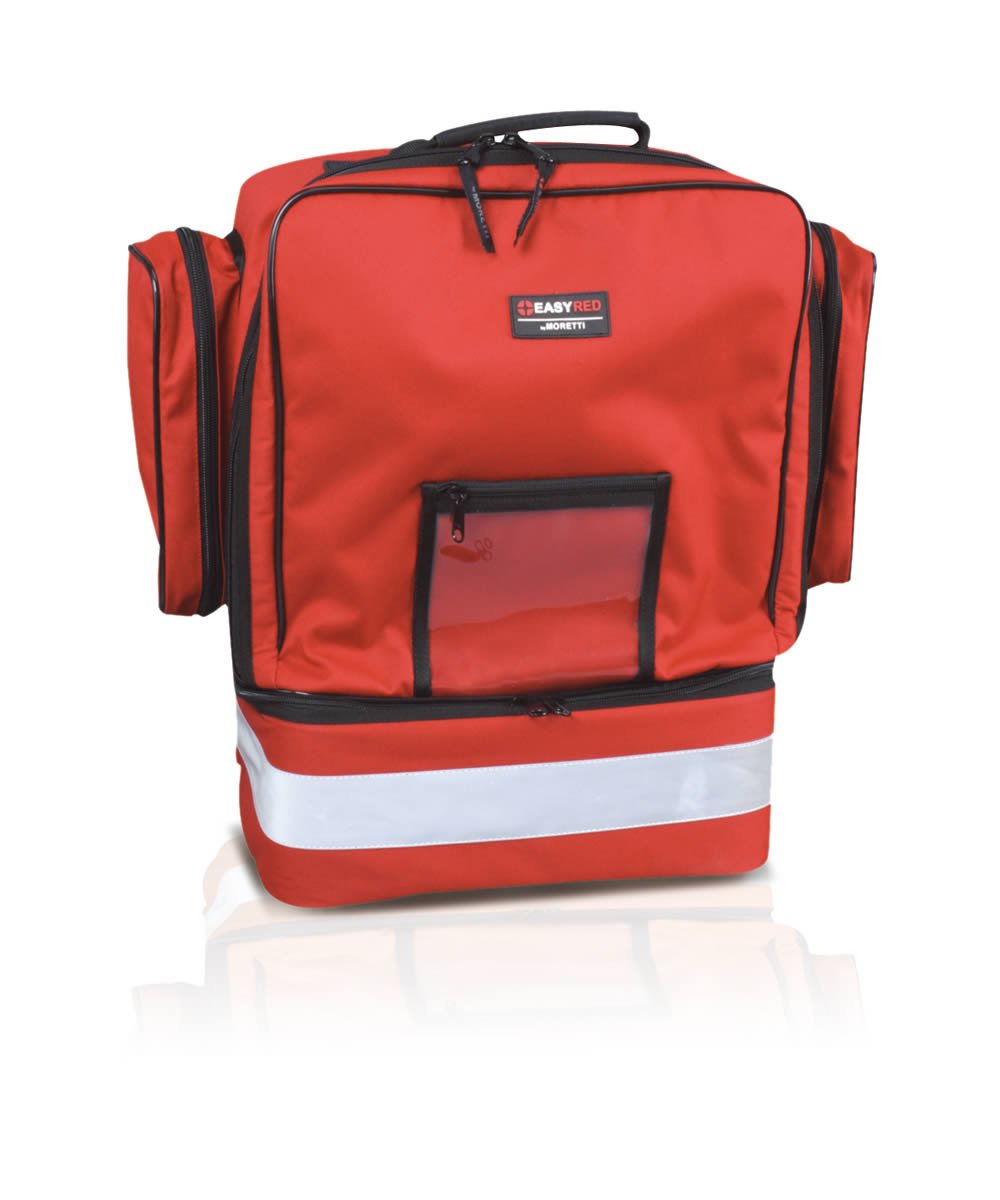 Zaino per emergenza e primo soccorso realizzato in materiale antistrappo a due sezioni. Particolarmente adatto a trasportare i presidi per l'emergenza in assoluta sicurezza permettendo una estrema liberta di movimento. La sezione inferiore è rigida e permette di ospitare presidi o apparecchiature delicati o di pertinenza medica. La sezione superiore permette grazie agli alloggiamenti presenti e modulabili di ospitare il materiale di pronto soccorso, il pallone di ventilazione la bombola di ossigeno e quanto altro necessiti. Grande alloggiamento interno allungabile predisposto con elastici e tasche con chiusura a velcro per l'inserimento di altro materiale di soccorso. Completo di tasche laterali con chiusura a cerniera per il materiale di prima necessità. Trasportabile a mano o a spalla. Le cinghie per il trasporto a spalla e la parte posteriore sono realizzati in materiale imbottito per offrire un maggiore confort durante il trasporto. Completa di strisce anteriori e laterali in materiale riflettente e piedini di sicurezza antiscivolo. Dotato di finestra trasparente per l'inserimento del logo dell'associazione di appartenenza.