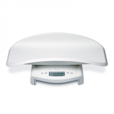 Bilancia pesa neonati, alimentata a batterie, modificabile in bilancia da terra per bambini. Grazie alla sua doppia funzione, semplicemente premendo un pulsante, il piatto può essere rapidamente rimosso, consentendo la pesata, sulla robusta base, a bambini fino a 20 kg.